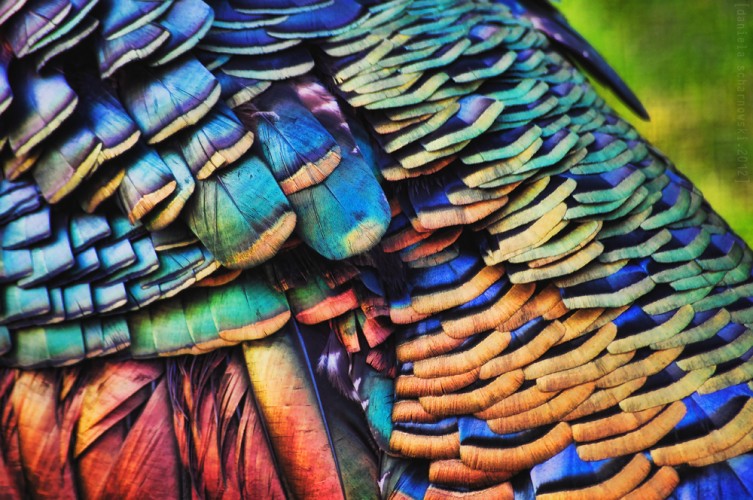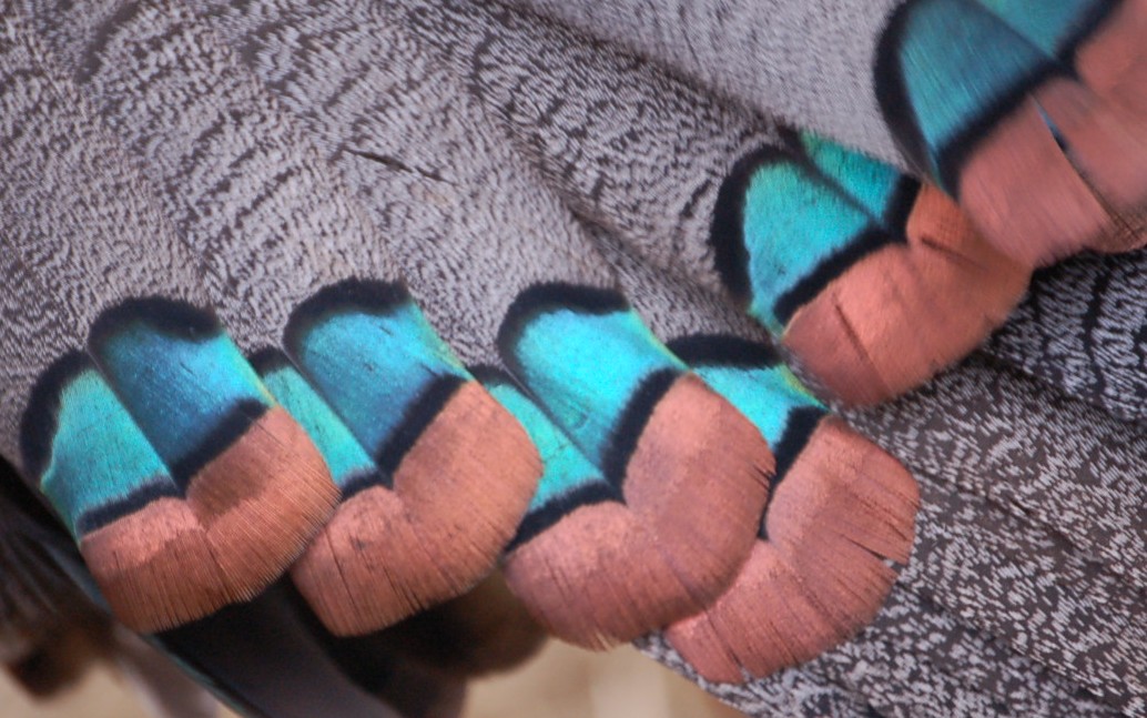 Both sexes also have bluish-grey tail feathers with eye-shaped spots and gold tips. The eye-shaped spots are called ocelli, which is where the turkey gets its name: the ocellated turkey.