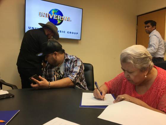 Abuela Irma signing the contract with Universal