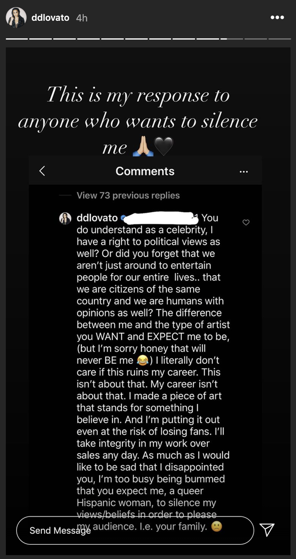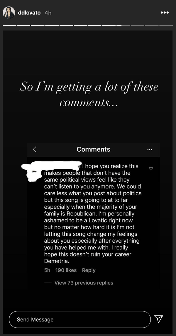 "This song is going too far. I'm personally ashamed to be a Lovatic right now," one fan wrote in a comment that Demi shared to her stories. "I really hope this this doesn't ruin your career Demetria."