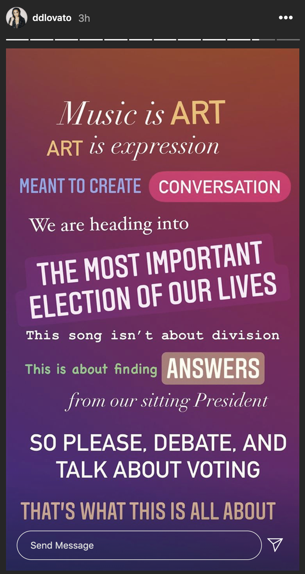 In her stories Demi also clarified that her song isn't about creating division, it's about "creating conversation."