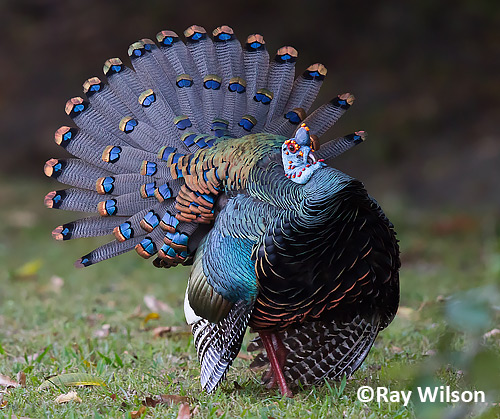 Ocellated male turkey strutting his stuff, mostly being ignored by females.