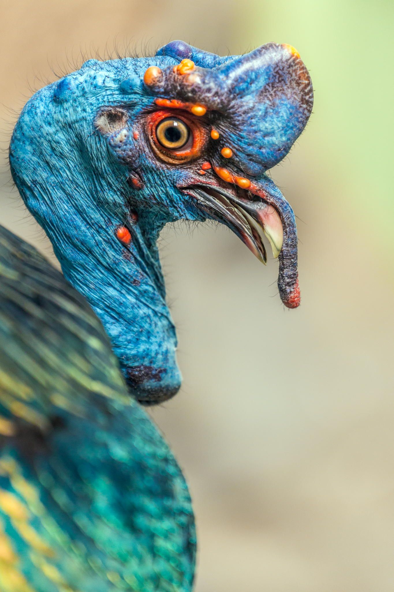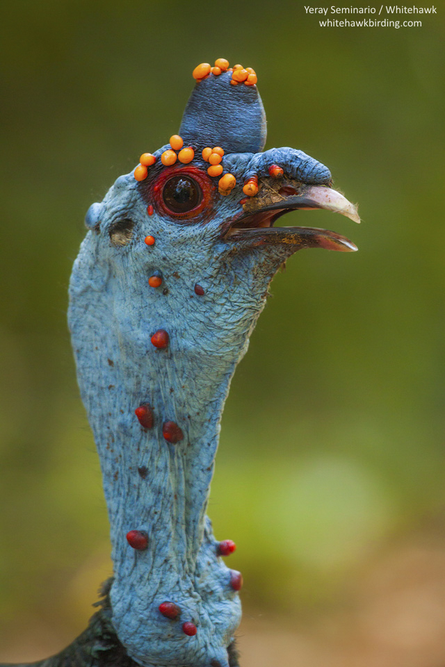 Their strange blue heads with orange and red nodules remind us that birds are directly descended from dinosaurs.